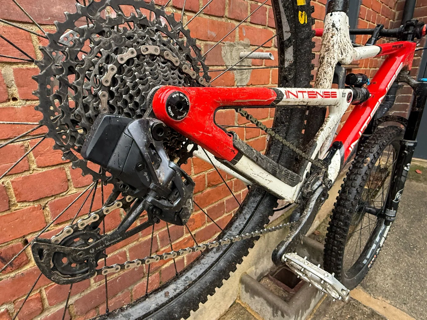 Removal of old drivetrain parts, installation of new components, alignment checks and full gear setup.